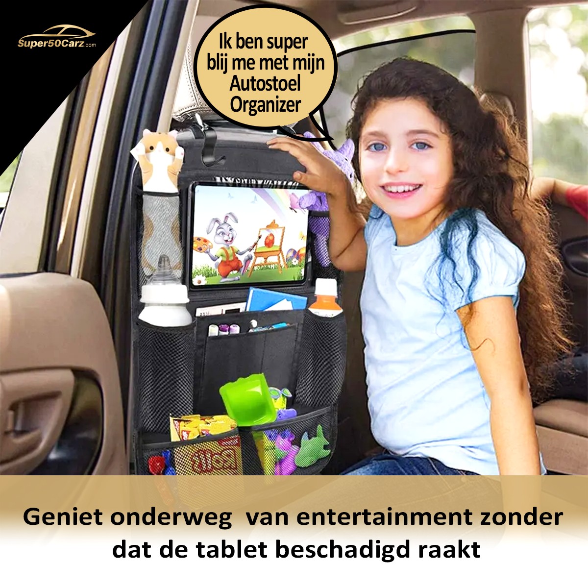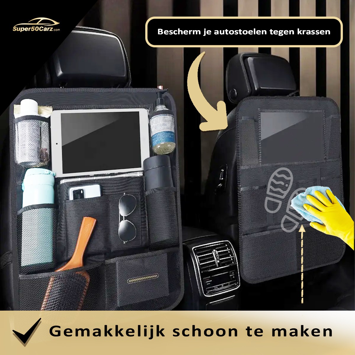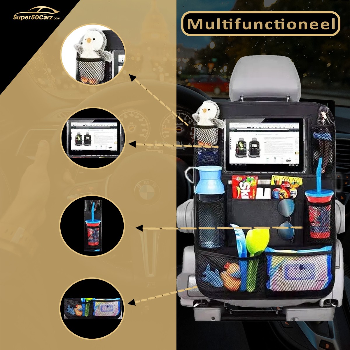 Met de Luxe Autostoel Organizer van Super50Carz hoef je je nooit meer zorgen te maken over een rommelige autorit. Deze multifunctionele organizer is gemaakt van duurzaam Oxford stof en is waterdicht en gemakkelijk schoon te maken. Daarnaast beschikt deze handige organizer over een doorzichtige tablethouder, zodat je onderweg kunt genieten van je favoriete films en series.