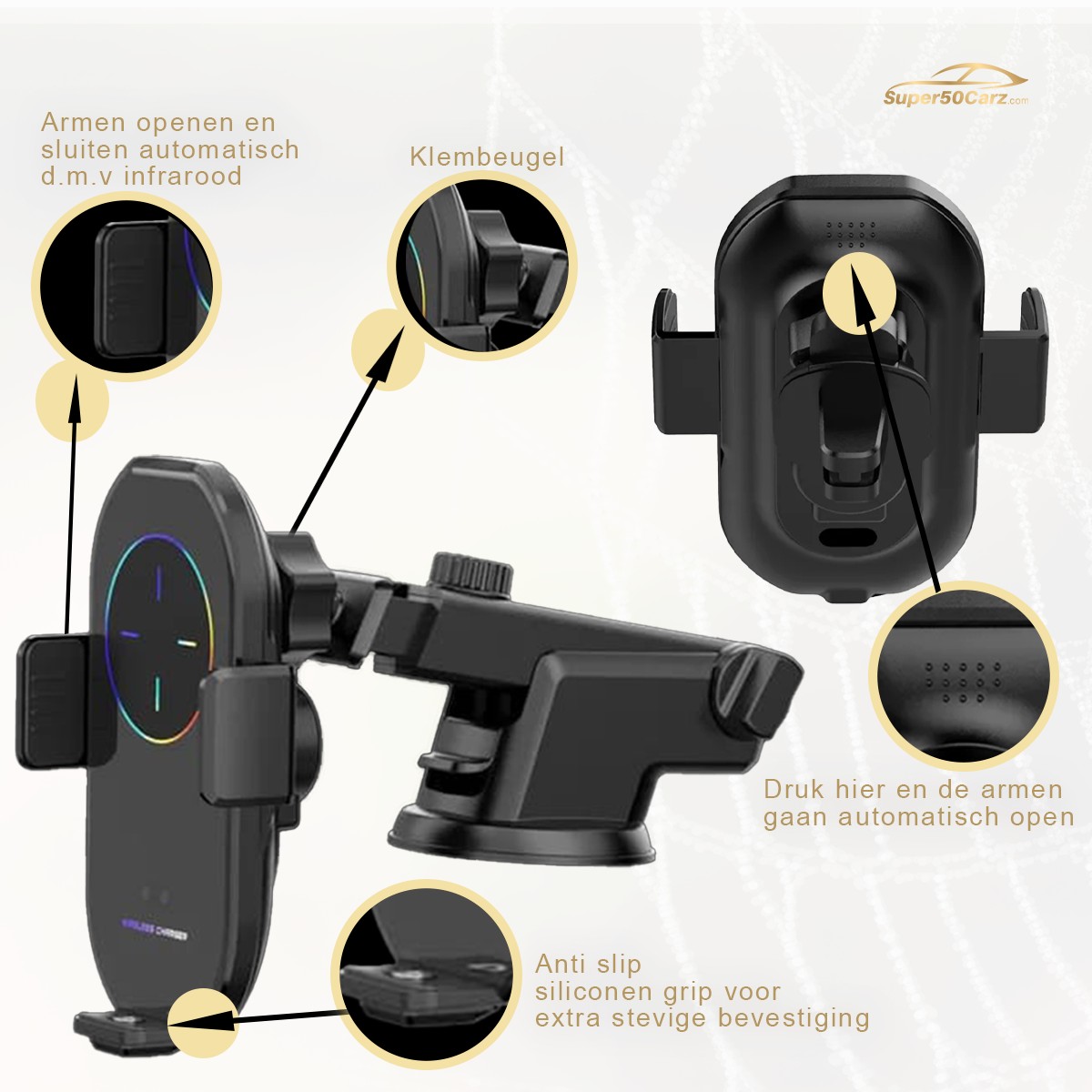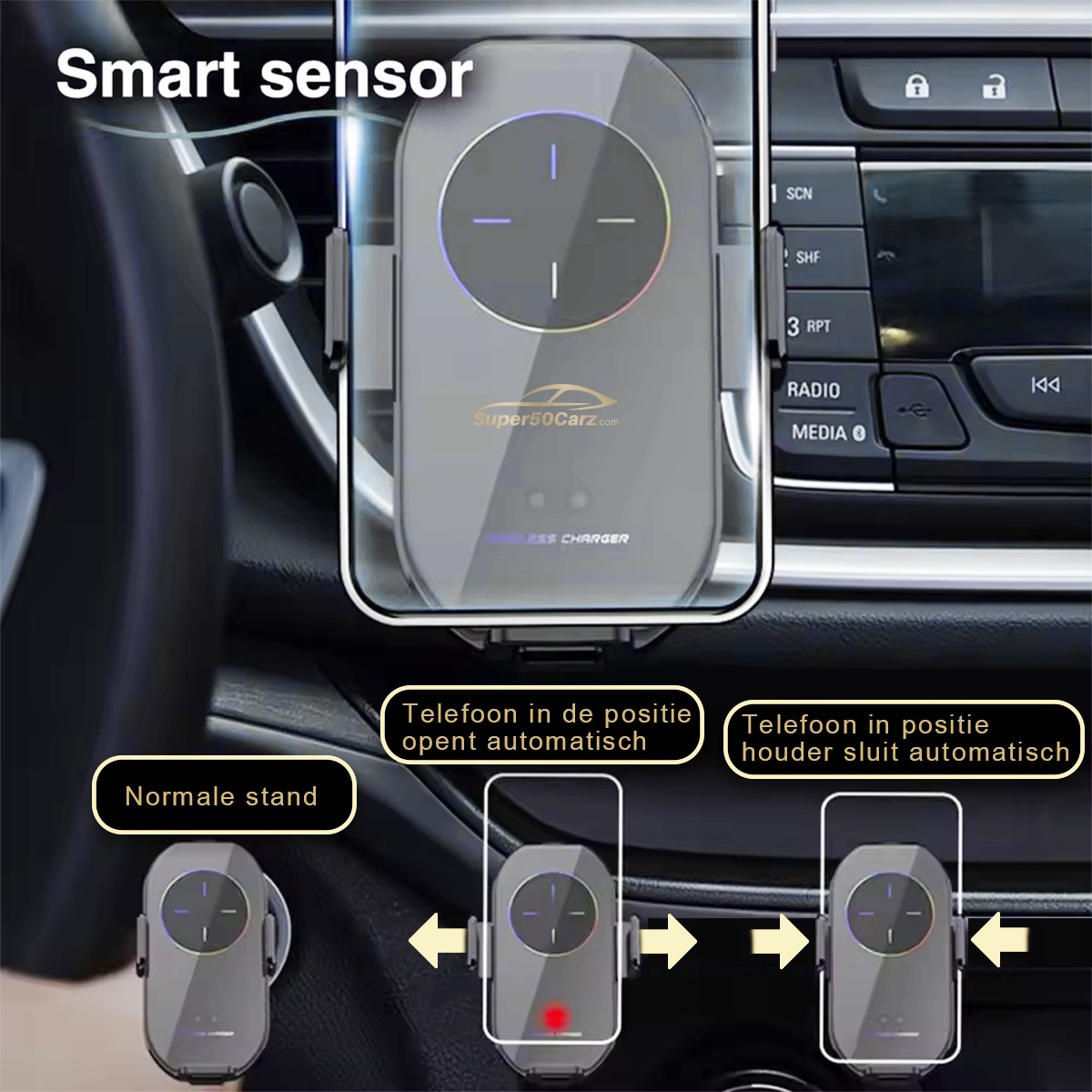 Met het automatische open/dicht systeem van de infrarood sensor detecteert de telefoonhouder wanneer de smartphone in de houder geplaatst wordt. Vervolgens klemt de houder de telefoon automatisch vast en begint met opladen. Met een eenvoudige handbeweging langs de sensor openen de kleppen automatisch en haal je je telefoon weer uit de houder. Zo kun je veilig en gemakkelijk je telefoon gebruiken in de auto.